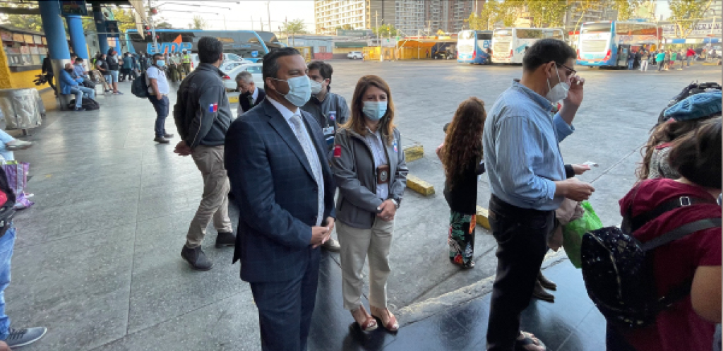 En el terminal sur de Estación Central estuvieron presentes esta mañana el seremi de Transportes de la región Metropolitana, Alfredo Quezada, y la jefa nacional del Programa de Fiscalización del Ministerio de Transportes y Telecomunicaciones, Paula Flores, para entregar recomendaciones ante la salida masiva de pasajeros desde la capital a distintas regiones por motivo de las fiestas de fin de año.