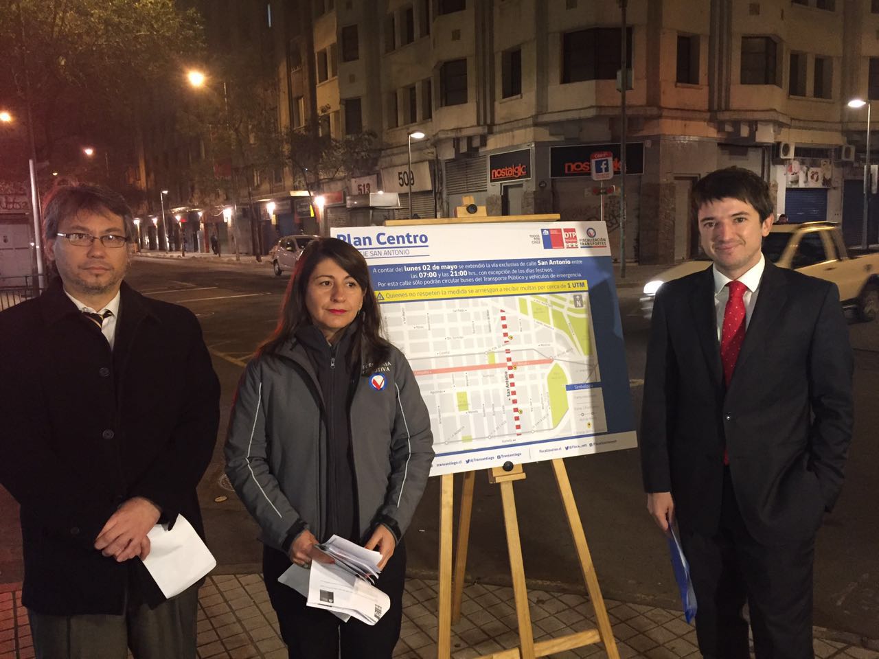 Santiago, 10 de mayo de 2016.- El Subsecretario de Transportes Cristián Bowen, junto al Director de Transporte Público Metropolitano, Guillermo Muñoz y la Jefa del Programa de Fiscalización, Paula Flores, realizaron una inspección al funcionamiento de calle San Antonio en Santiago Centro, que desde hace una semana se convirtió en una vía exclusiva en horario extendido, de lunes a viernes. Esto, en el marco del Plan Centro que se implementa actualmente en la comuna de Santiago.