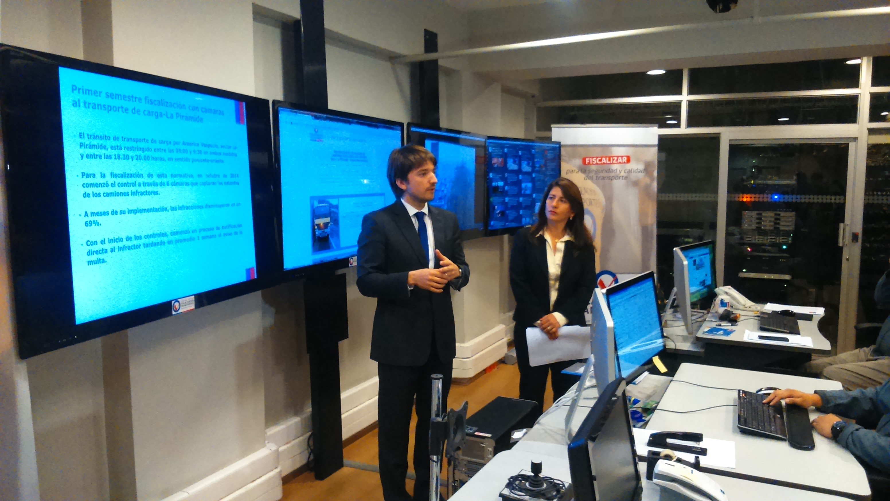 A seis meses de la implementación del sistema de cámaras de fiscalización, el tránsito de camiones en el sector La Pirámide, entre El Salto y Vitacura, ha disminuido en un 70%. Así lo anunció el Subsecretario de Transportes, Cristián Bowen, junto a la Jefa de Fiscalización, Paula Flores, luego de hacer un balance en las oficinas del Programa de Fiscalización del Ministerio de Transportes y Telecomunicaciones.