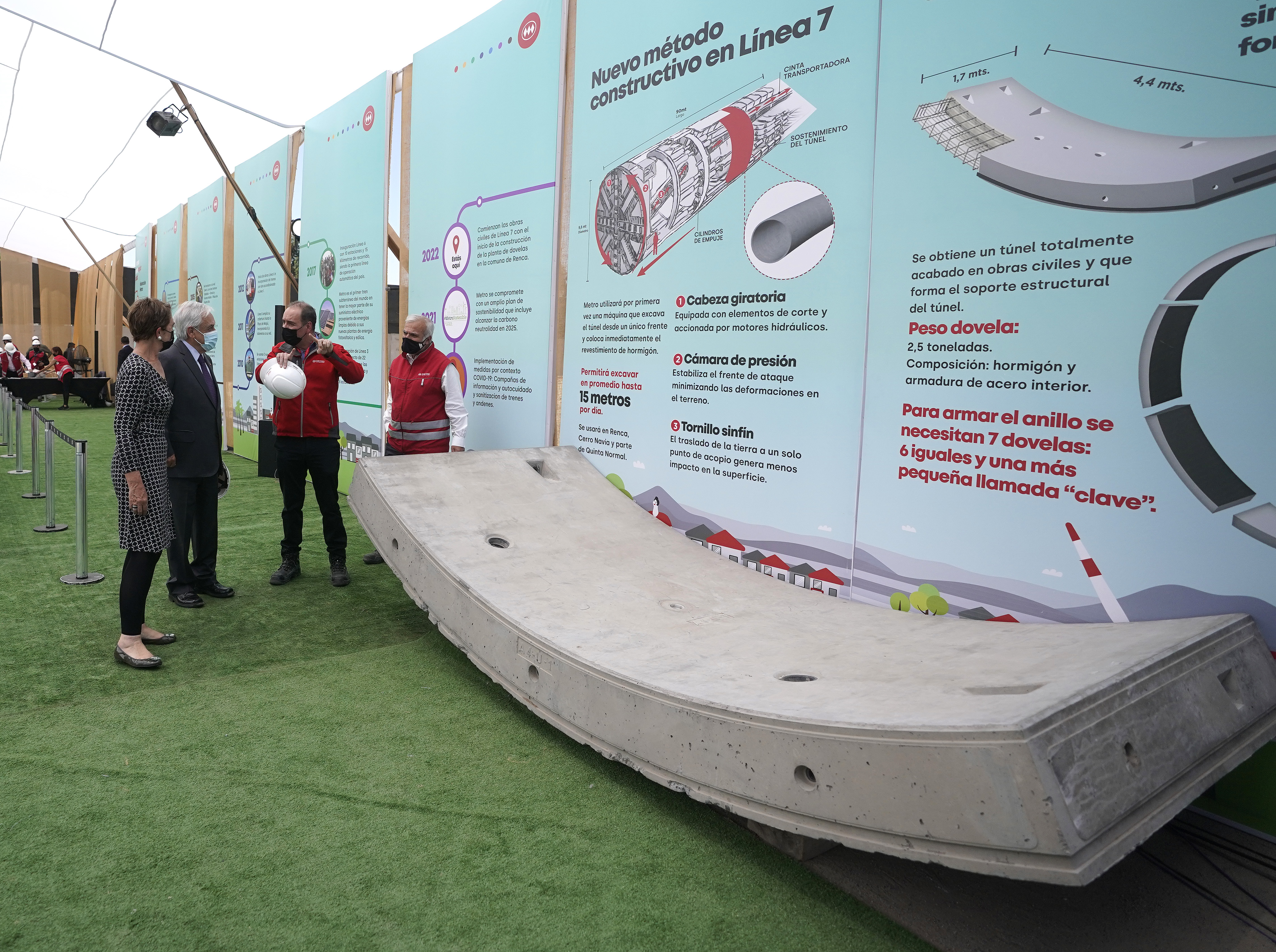 El Presidente de la República, Sebastián Piñera, junto a la Ministra de Transportes y Telecomunicaciones, Gloria Hutt, el Subsecretario de Transportes, José Luis Domínguez, y el Presidente de Metro, Louis de Grange, visitaron hoy el lugar donde se emplazará la planta de dovelas -estructuras de hormigón-que permitirán crear los túneles de la futura Línea 7, dando así inicio a las primeras obras en el marco de la construcción de la nueva línea del tren subterráneo.