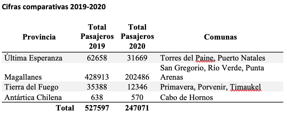En la provincia Antártica Chilena, no fue tanta la disminución de pasajeros siendo 570 el 2020 (89%) de los 638 pasajeros registrados el 2019. En Tierra del Fuego fue notoria la baja en la movilidad, ya que si en 2019 fueron 35.388 los pasajeros que hicieron uso de estos servicios, en 2020 sólo lo hicieron 12.346, es decir un 35% de lo que se movilizó el año anterior.
