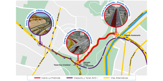 Durante el cierre de La Pirámide se habilitará la marcha blanca del viaducto y el túnel de la futura autopista Vespucio Oriente. Esto para aquellos automovilistas que se desplazan desde Huechuraba hacia Vitacura y Las Condes, quienes dispondrán de salidas en las calles Escrivá de Balaguer, Candelaria Goyenechea, Ramal Mapocho y Los Militares.