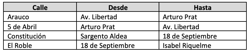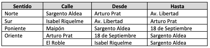 El perímetro de la zona céntrica definida en la comuna de Chillán está dado por las calles Av. Libertad por el norte, 18 de Septiembre por oeste, Arturo Prat por el sur y Sargento Aldea por el oriente. El plan considera ser aplicado de lunes a viernes desde las 7:00 hasta las 14:00 hrs.