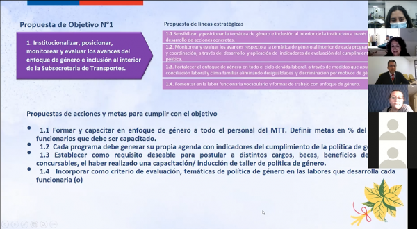 La actual Política de Equidad de Género en Transportes, generada el año 2018 por el Ministerio de Transportes y Telecomunicaciones, constituye un instrumento de planificación pública desarrollado de manera participativa, cuyo objetivo general se enfoca en “transversalizar el enfoque de género en las políticas de la Subsecretaría de Transportes, contribuyendo a la igualdad en la movilidad, accesibilidad, seguridad y eficiencia del transporte, para disminuir o eliminar brechas, inequidades o barreras entre los géneros”.
