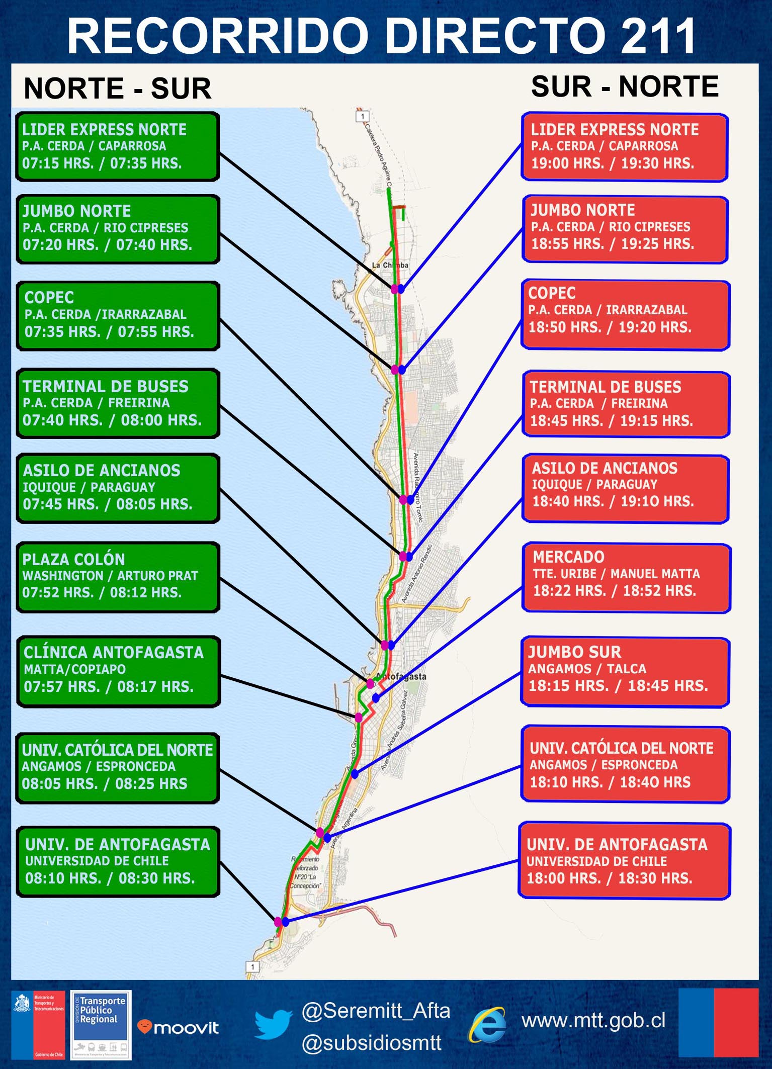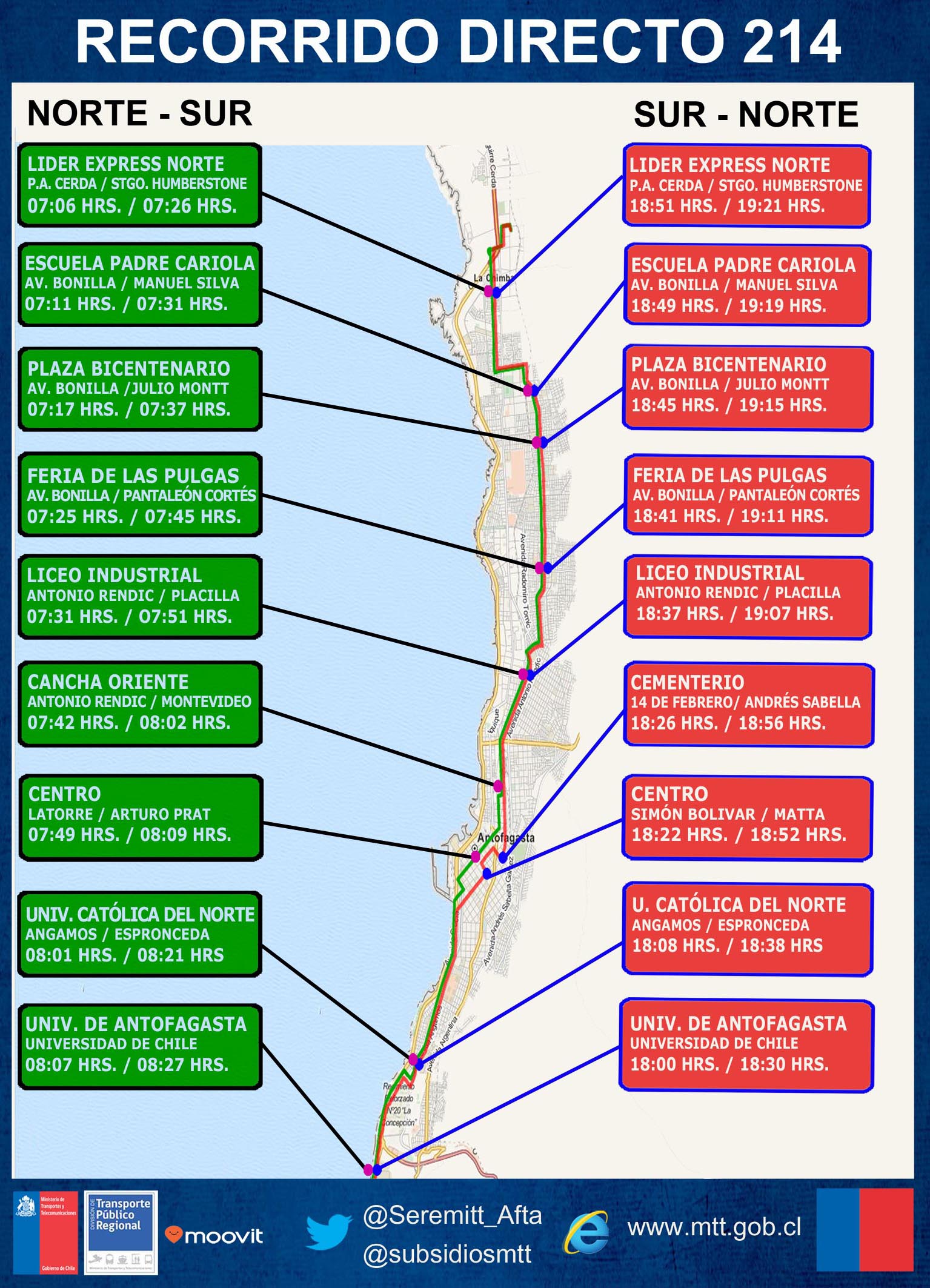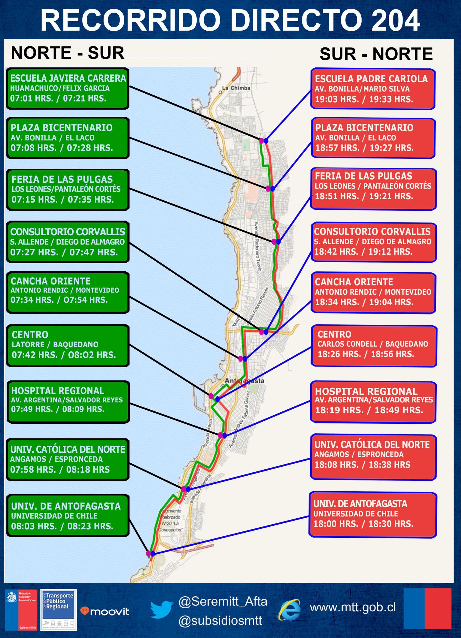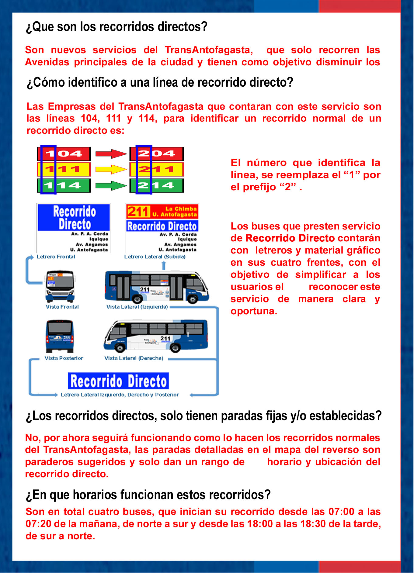 Inmerso en el plan estratégico para la implementación y puesta en marcha de los Recorridos Directos, la Secretaría Regional Ministerial de Transporte y Telecomunicaciones dio a conocer a la comunidad de Antofagasta, horarios y paradas referenciales, como a su vez cambio en la numeración que identifica este servicio. Lo anterior en virtud, de poder simplificar a los usuarios el reconocer este servicio de manera clara y oportuna, como a su vez estar al tanto de las principales características que posee como lo es la disminución de los tiempos de viaje y poseer trazado simple y expedito por las principales avenidas de la ciudad.