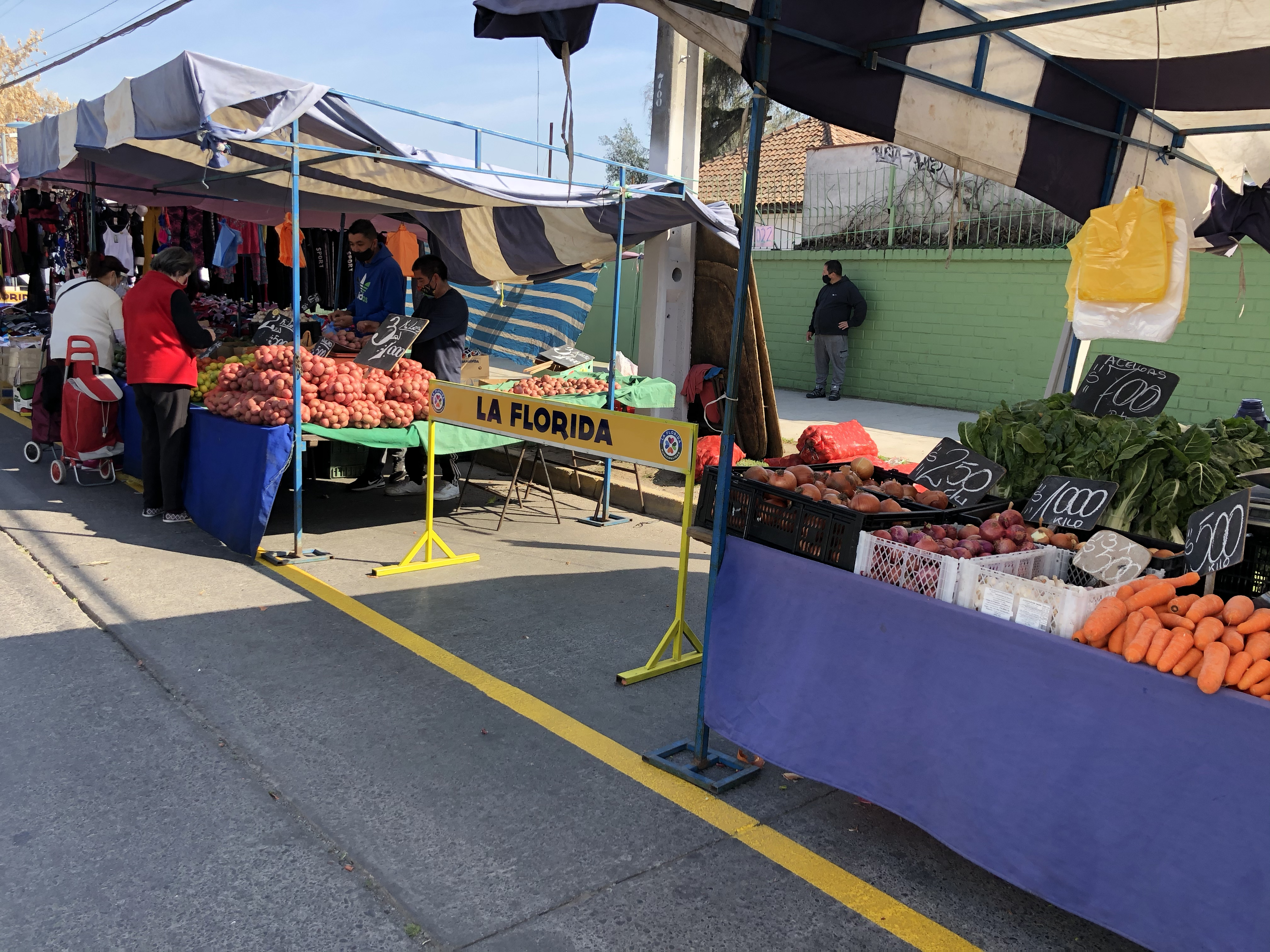 Con distancia entre los distintos puestos de venta de frutas y verduras y como también con demarcaciones en el piso cuenta la Feria Santa Amalia, de la comuna de La Florida, medidas que fueron implementadas para favorecer el distanciamiento físico entre las personas y prevenir así el contagio de Covid-19.
